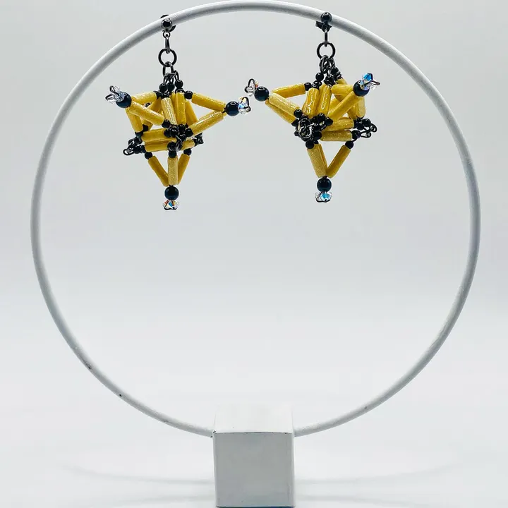 テキスタイルシリーズ◯GlitterBeige◯ 細長い竹ビーズを残布のグリッター入りのベージュ布を使用し、一からビーズを作っています 仕上げにコーティングしているので水に濡れても丈夫な仕様となっています こちらの残布は私が洋服制作の時に出た残布です 3DStarよりサイズが小さい為、星屑[Stardust]と名前をつけました 先の方にはスワロフスキーが付いていて 揺れた時に輝きがさらに増すデザインになっています ⁂mUIk UPCYCLE Story⁂ 衣服の大量生産・大量消費が拡大し、ライフサイクルの短期化によって大量破葉に繋がっているこの現状にファッションが大好きな私にとってとてもショッキングなことでした。 ただ捨ててしまう衣服や残布を私もなりにどうにか再利用することができないか考えた時 出来上がったのがこの作品です。 ほんの少しのことかもしれませんが少しでも持続可能なことに貢献できたら幸いです。