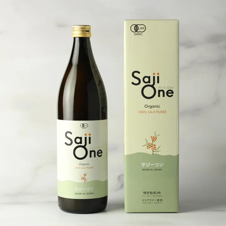 有機JAS認定サジーを100%使用したピューレジュース 900ml(約30日分) オーガニックのビコアサジー以外、余計なものは一切入れず、自然の恵みをそのままに味わえるサジーピューレジュース。今世界中が注目しているスーパーフルーツのひとつ《サジー》には、鉄分やビタミンACEなどの現代人に不足しがちな栄養成分がなんと200種類以上含有!毎日飲むものだから…甘味料、着色料、香料、防腐剤等、一切不使用の無添加で安心です。 スーパーフルーツと言われている《サジー》には「植物由来の栄養成分」が豊富。ビタミン類をはじめ、鉄分を含むミネラル類、アミノ酸類、ポリフェノール・フラボノイド類、有機酸類、食物繊維などその他合わせて、なんと200種類以上!手軽に摂れるので、毎日続けやすいのもポイントです。 奇跡の果実《サジー》には品種がさまざま。サジーワンは、その中でも特に栄養価の高い、内モンゴルの高地に自生する希少な「ビコアサジー」を使用しています。他のサジーと比べて、実は小さく赤みがあり、果肉がぎっしり。その濃い色は栄養価も高く、味も濃厚な証です。もちろん、野生で自生しているオーガニックサジーです。 毎日口にするものだからこそ、安全なものをご提供するために、サジーワンでは国際基準の品質管理を徹底しております。サジーワンは、日本のオーガニック(有機)認証を取得したサジー原料を使用し、品質管理(食品安全)ISO22000認証、衛生管理HACCP認証を取得した環境下で製造し、さらに輸入時には、残留農薬検査・放射能検査・清涼飲料水規格試験など数々の検査を実施しています。検査に合格したサジー原料は日本のオーガニック(有機)認証を取得した国内工場で商品化しておりますので安心してお召し上がりいただけます。 ※SajiOneはドリンクタイプの健康食品ですので、お好みのタイミング・量でお飲みいただけます。※はじめての方は、まずは30mlからがお勧めです。 ●1日当たりの摂取目安量:30~60ml ●摂取の方法:1日30~60mlを目安に、3~4倍程度に希釈してお飲みください。※3倍希釈時果汁33%(サジー1:水など2) ●摂取上の注意:酸味が強いため、食後などに希釈してお飲みください。 ●保存料未使用のため、開栓後は1か月を目安に早めにお召し上がりください。 ●天然の原料を使用しているため、果汁の成分が沈殿・浮遊している場合がありますが、品質には問題ございません。 ●食物アレルギーの方、お薬を服用中あるいは通院中の方は、医師に相談してください。 ●体質や体調に合わない場合はご使用を中止してください。 ●開栓後は1か月を目安に早めにお召し上がりください。 ●開栓後はしっかり蓋を閉めて、液漏れ防止のため冷蔵庫に立てて保存してください。 【原材料】有機サジーピューレ(中国(内モンゴル自治区)製造) 【内容量】瓶タイプ:900ml 【保存方法】高温多湿、直射日光を避け、冷暗所で保管してください。開栓後はフタをしっかり閉め冷蔵庫に入れ、液漏れ防止のため、立てて保管してください。保存料を使っておりませんので、開栓後は1ヶ月を目安に、早めにお召し上がりください。 【栄養成分(30ml当たり)】エネルギー:19.45kcal、たんぱく質:0.15~0.45g、脂質:0.17~0.52g、炭水化物:1.91~5.73g、食塩相当量:0.01~0.02g 【注意事項】食物アレルギーの方、お薬を服用中あるいは通院中の方は医師にご相談ください。 キーワード *本内容は商品説明ではありません* サジーベリー 健康ドリンク 栄養ドリンク 美容ドリンク オレンジジュース 野菜ジュース フルーツジュース 置き換えダイエット 美味しい ビタミンC 鉄分 オレンジ 朝ごはん ノンカフェイン 子ども ギフト プレゼント 誕生日 母の日