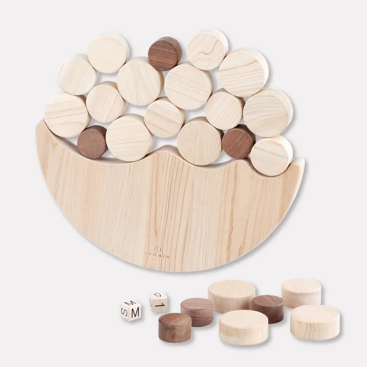 ウォルナットとひのきのコマは、重さも大きさも個性的。 ウォルナットと大きいひのきの持ち比べをすれば重さの違いが分かります。 すべてを積み上げるのは意外と難易度が高く、大人も夢中に、そして真剣になってしまいます。 完成させられるようになったら、次は片手だけで載せる、付属のサイコロで出た数を積み上げるなど、ルールを増やすと更に楽しく盛り上がることまちがいなし! コットンの収納袋付なので、収納すればひのきの香りを保ち、持ち運びも可能です。 ウォルナットとひのきのバブル(こま)は、重さも大きさも個性的。 すべてを積み上げるのは意外と難易度が高く、大人も夢中に、そして真剣になってしまいます。 セット内容:波 1個、バブル(小8個、中12個、大10個)、サイコロ 2個 付属品:コットン袋 1枚