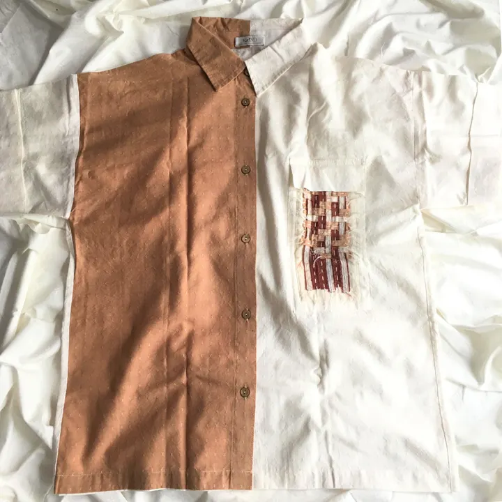 ホワイトとブラウンのコンビネーション シンプルなデザインで、日常使いにぴったりの快適さ。 一つ一つがユニークで、ポケット部分には特別な編み込みアクセントが施されています。 一枚一枚手織で作っているため、温かみのある風合いを感じていただけます。 天然染料を使用した色合いで、環境にも優しいアイテムです。