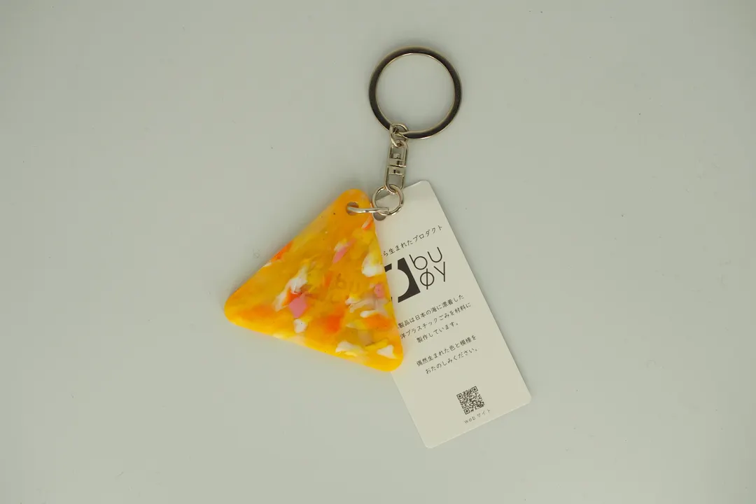 幾何形体モチーフのシンプルなキーホルダーです。 表面にはbuoyのロゴ、裏面にはSDGsの目標キャッチコピー「LIFE BELOW WATER(海の豊かさを守ろう)」が刻印されています。 buoyの製品は全て日本各地で回収された海洋プラスチックごみを材料に作っています。着色などの加工を加えず、偶然海岸に漂着した色味でできています。 明るい発色が特徴のプラスチックですが、複数の色が交じり合うことでちょっと有機的なモザイク模様が特徴です。 製品にはひとつひとつゴミの漂着地域が明記されています。日本で起きている海洋ごみの問題をリアルに感じることができます。 また、商品に添付されているQRコードを読み込むとそれぞれの回収を行ったビーチクリーン団体さんの情報を見ることができます。 ------------------------------------------------------------------- 海洋プラスチックごみを材料に変える独自技術buoyの特徴 (buoyは海洋プラスチックごみ素材使用を前提にした株式会社テクノラボの独自技術により成形しています。株式会社テクノラボは本技術において特許取得済み) ◆材料を分けないで成形するため生まれる独自の模様 材料はすべて着色せず海洋ごみの色を活かして成形しています。偶然生まれる色と模様は回収された漂着ごみによって決まります。 ◆製品の重さが海洋ごみの重さ 製品をコーティングしているフィルム以外、混ぜ物などせず海洋ごみでできているので製品の重みから海洋ごみ問題を感じられます。 ◆製品にすべて材料の漂着地を明記 buoyは日本各地のビーチクリーンボランティアや企業の方から材料を提供していただいています。これらの材料は時期と地域を分けて管理され、製品にはすべて材料産地のシールを貼り販売しています。 buoyの材料産地をきっかけに回収された地域のことを知ってほしいとの思いからbuoyでは団体様の紹介ページを作成しています。 http://www.techno-labo.com/rebirth/partner/ -------------------------------------------------------------------