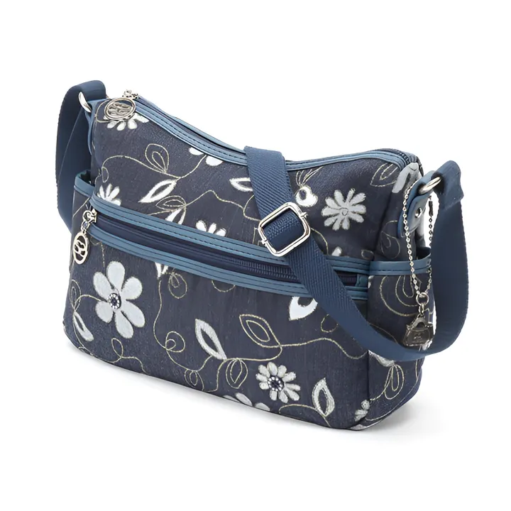 デニム地に花模様をプリントしたショルダーバッグ,花柄プリントのラメがきらきらと華やかな印象に!前面にファスナーもあり使い勝手も抜群◎開口タイプ/ファスナー式■ポケット/(内側)ファスナー×1、オープン×2(外側)後ファスナー×1