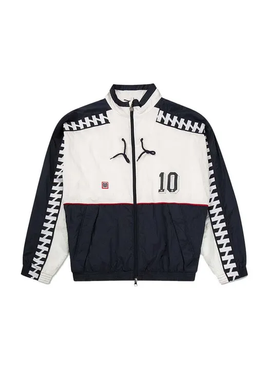 大胆に配したメイバトラックテープとブランドロゴがかっこいいバイカラージャケット。 胸元のドローコードやダブルジップなどデザインと実用性を兼ね備えたアイテム