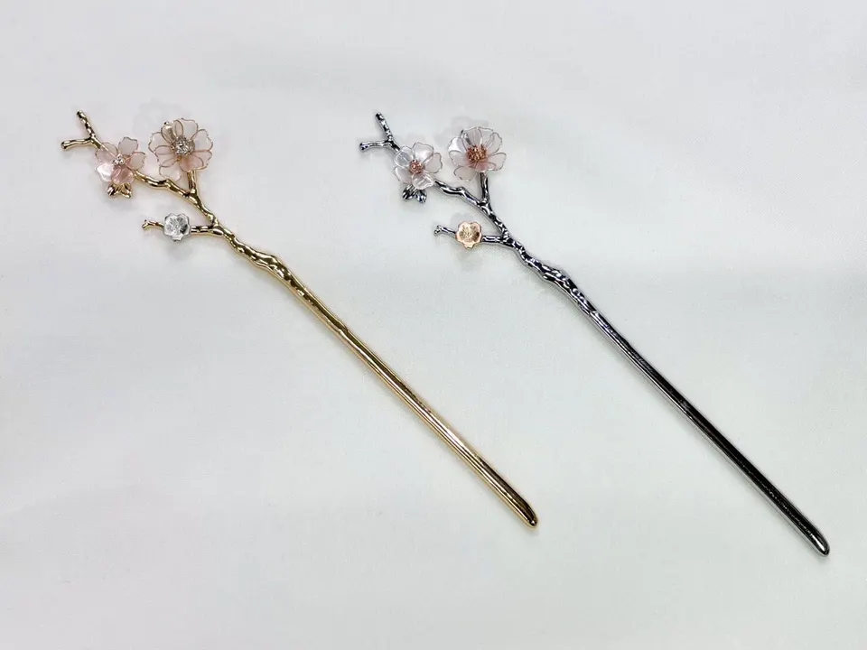 繊細な桜の花をイメージしたかんざしです。 花の部分は透明感のあるディップフラワーで作られ、優雅な光を放ちます。 かんざしの土台は、木の枝の形状を再現しており、繊細でありながらも存在感のあるデザインです。 和装だけでなく、洋装にも合わせやすく、上品なアクセントとして様々なシーンでお使いいただけます。