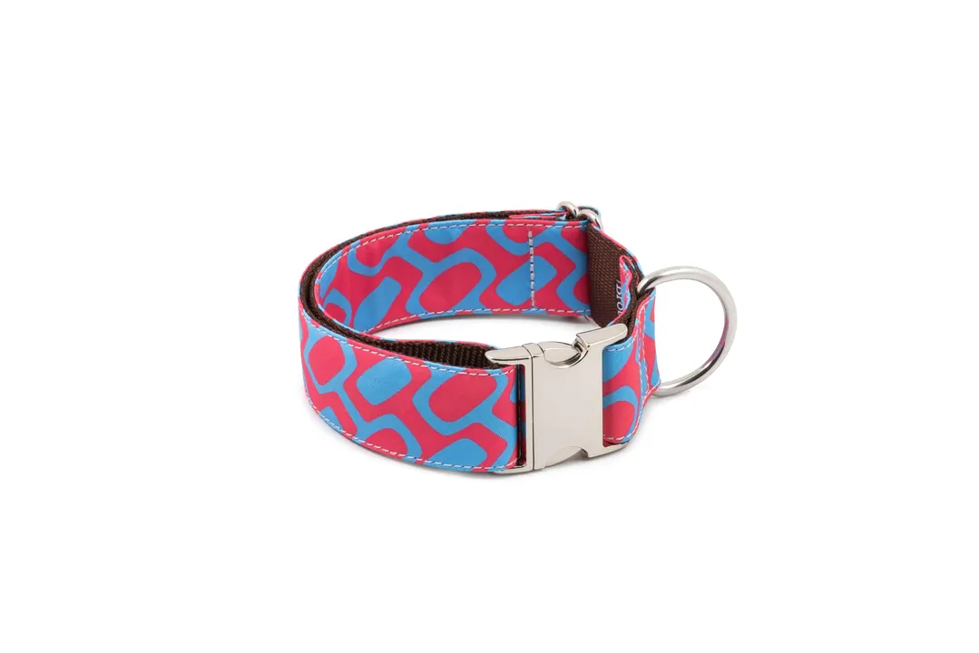 2025新色 ? クラシックを大胆に覆し、フューシャピンクとエレクトリックブルーの幾何学的なウェーブ柄で彩られた首輪。 最もエネルギッシュな季節から着想を得た、まさに“ビジュアルの爆発”。 リサイクル素材を使い、工房で一点ずつ丁寧に仕立てられた首輪は、デザイン性と快適さ、そしてサステナビリティを兼ね備えています。 スタイルとパワフルな個性を持つわんちゃんにぴったりの一本です。 ?