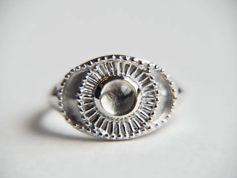 ・コンセプト 「心の内に秘めた光を引き出し、身に纏う人そのものを輝かせたい。」人は誰しも、心にきらりと輝く光を持っています。その光は、人それぞれに形が異なるからこそ美しく、素晴らしい。Rinnは、心に宿る光に寄り添うように、身につける人そのものを輝かせるジュエリーを提供しております。 「毎日身につけても壊れにくく、時を重ねるとともに肌に馴染んでいくようなジュエリーを」 Rinnは身につける人の肌と生活に馴染むジュエリーを提供しております。 ・デザイン 「他になく、永く愛されるデザインを。」 ジュエリーのデザインは、日常に溶け込んだささやかな美しさから生まれます。 例えば揺らめく布の柔らかさに触れた時や、朝陽が昇る瞬間に霞んでいたものが透き通って見えた時、感じ取った自然の美しさがジュエリーの形になっていきます。 そこへクラシカルな要素を取り入れることで、"Rinnにしかないデザイン"を意識いたしました。 お客様の生活に寄り添い続けるために、永く愛され続けるデザインにこだわりました。 そこには「親から子へと、時代を超えて受け継がれていって欲しい」という想いも込めております。どんな人にもどんな装いにも、しっくりと馴染み続けていくよう願いを込めてジュエリーを製作しております。 ・アイテム 天然石を中心置き、指輪の腕部分にまで精細な装飾を施した16世紀ごろのリングをモチーフにしたリングです。 ホワイトトパーズとシルバーカラーがクールな印象です。