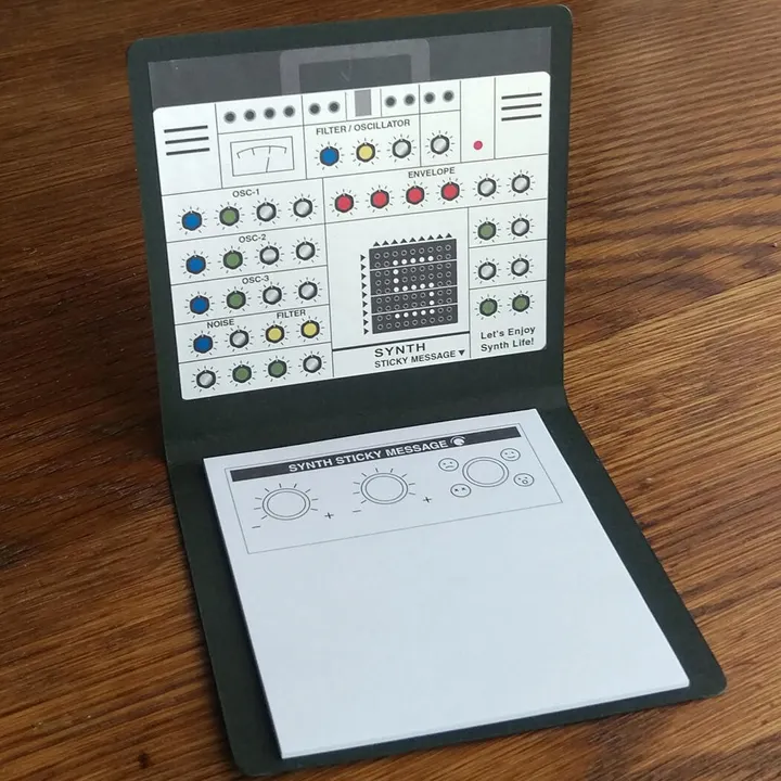 Synth Sticky A は シンセサイザーデザインの付箋です。 アナログシンセの名機 をイメージしました! アタッシュケース風カバーに、メタリックシルバーパネルシールを貼り合わせ上品に仕上げました。 付箋部はツマミをデザインしたSynth Sticky Message(SSM)を搭載。 項目を記入してツマミに線を加え、フェイスアイコンをセレクトすれば強力なメッセージ付箋が完成します! クリエイティブメモや、ちょっとしたお礼に。 メカニカルなツマミとメッセージにトキメクこと間違いなし。 サンプルセッティング(使用例)シートもついています。 アイデア次第で色々な使い方ができるシンセサイザー形付箋です。 〈Synth Sticky A 商品内容〉 本体(Synth Sticky A) 付箋(SSM)20枚 説明書(サンプルセッティングシート付き)