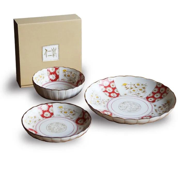 古来より日本の人々に愛されてきた「菊」は吉祥文様の一つで幸福や繁栄、縁起が良い等めでたい意味があり、“菊を飾ると福がくる”とも言われます。 菊型のお皿に繊細なタッチと可愛らしい色合いで菊が描かれ、様々な料理に合わせていただけます。 日本の「菊」を日々の食卓の中に。おもてなしにも、おひとり様にも使いやすい、3種類のお皿をセットにした華やか揃です。 メイン、取り分け、小鉢と用途に合わせてお使いいただけます。