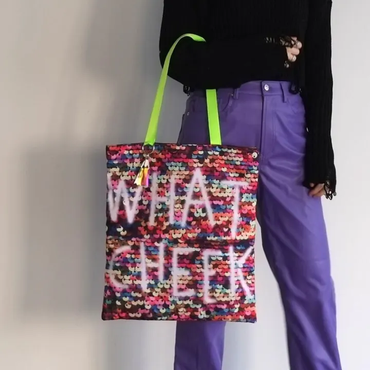 スパンコールプリントのビッグトートバッグ。 本体にはふわふわの中綿入りで厚みがあり、しっかりとした印象に仕上げました。 全体にはキラキラと輝くスパンコールのプリントをしており、 "WHAT CHEEK!" (なんて生意気な!) とスプレーで落書きしたようなデザインに。 たくさん荷物を入れても負担がないように、ハンドルを肩掛けできるよう長めの仕様に。 内側にはオープンポケットとジッパーポケット付き。 バッグ本体の容量が大きくても、小物収納バッチリ! 『cheek』アイコンのヒキテチャーム付き★ 【cheek 販売価格について】 弊社設定上代(税込価格)での販売をお願い致します。 また、商品に対してのクーポン等はご遠慮いただいております。 ショップ全体でのクーポン等は問題ございません。 ご理解・ご了承のほどお願い致します。
