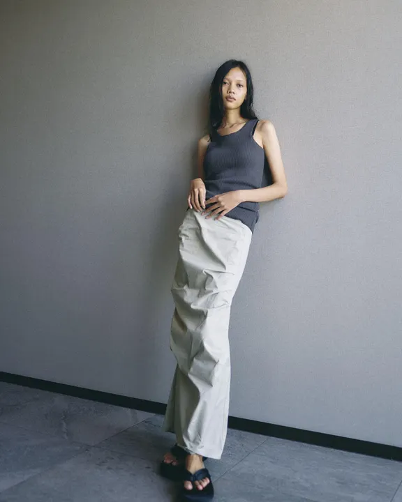 太番手のブークレー糸をローゲージの編み機でざっくりと編み立て、ニットライクな表情に仕上げた素材を使用。 また、裏側にポリウレタンを挿入することで表側のリブを際立たせながら、肌に触れる面についてはさらりとしており着心地も抜群の1着です。 ネック・アーム周りや裾をロック縫いにしたことで、素材特性を活かした切りっぱなしのようなフィ ニッシュながら生地がほつれないデザインに仕上がっています。 一般的なキャミソールやタンクトップにはないさり気ないディテールや素材を使用し、ニットライクでありながら夏場にも着用可能になっています。