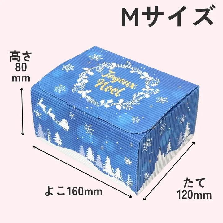 幻想的なブルーの夜空をサンタがソリに乗って駆けるクリスマス柄デザインの クラフトギフトボックスです。 片段ボールの立体的なあたたかみのある素材は、お菓子やプレゼントなど 幅広く使っていただきやすい人気商品! 思わず手に取りたくなる片段ボール素材の紙に、 印刷をしている商品を 販売しているのはオクトだけ!! 『これ珍しい〜!!』と手に取ってご覧頂ける事間違いなしッ! 同素材で作った、かわいいクリスマス柄のタグが箱と同数付属いたします。 3種類の形のタグを20枚ずつ計60枚、箱とセットにしての販売です。 マドレーヌ(50×70ミリ見当)が約 8〜10個入るサイズです。