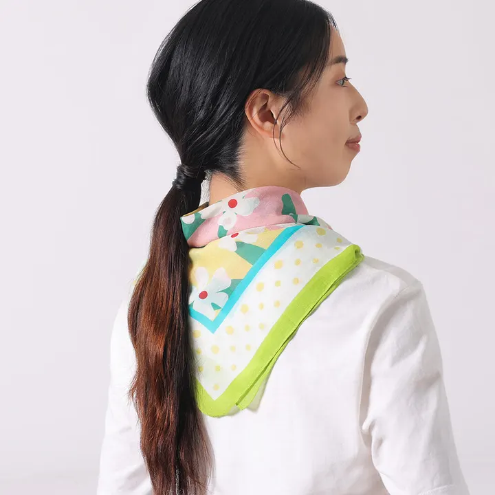 白い花とドット柄を掛け合わせたスカーフ。春夏らしい明るい色目がポイント。バッグの持ち手に巻いてアクセントになるアイテムです。