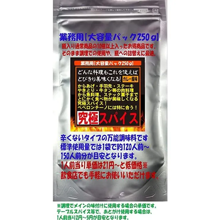 ★こちらの商品は業務用チャック袋入りお得パックです。通常の瓶入り商品24gと成分は全く同じです。容量と容器のみ異なります。 ★通常の瓶入り商品は内容量24gですが、業務用チャック袋入り商品は内容量250gとなっていて大変お得です。 ★送料無料です。(発送は定形外郵便、ゆうパケット、ネコポス、その他となりますが、お客様で発送方法をお選びいただくことはできません) 【原材料・成分】塩(岩塩)、にんにく、胡椒、ターメリック、クミン、コリアンダー、オレガノ、セージ、アミノ酸、他 【使用方法】様々なスパイスを配合した辛くないタイプの旨すぎ万能調味料のカレー味タイプです。から揚げ、ステーキ、焼き肉、チキンステーキ、やき鳥、生姜焼きなどの肉料理やパスタ、ポテトフライ、ピラフ、フライドチキン等にそのままかけてお使いください。BBQにも最適です。ポテトチップス、ポップコーン等のスナック菓子にそのままかけても大変美味しいです。