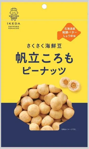 薄皮付きピーナッツに衣掛け、ホタテパウダーとバター醤油で味付けした創作豆です。