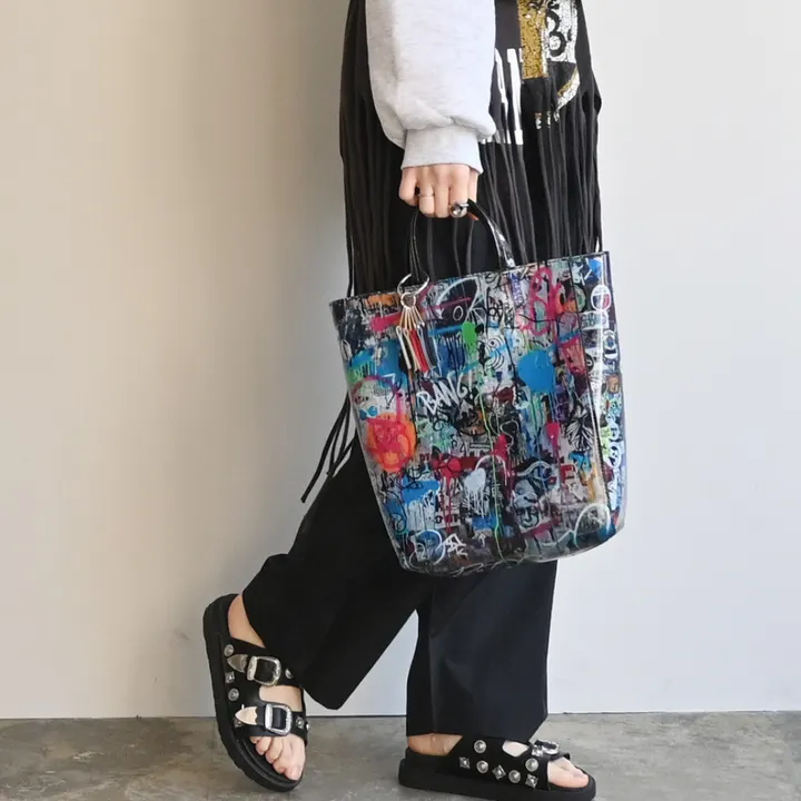 ● フォットコラージュしたプリントが存在感のあるスクエア型トートバッグ ● 視線を奪うアートプリント。 フォトコラージュ・マガジンコラージュ・アートコラージュと それぞれ違うプリントを施しています。 本体はしっかりと自立するスクエアフォルム。 バッグが倒れにくく、荷物が中で転がりにくい仕様。 ハンドルには光沢のあるエナメル生地を使用し、ツヤ感up↑ 付属のショルダーストラップは、長さ調整可能◎ ネオンカラーでアクセントに♪ 手持ち・肩掛けの2WAY仕様で、スタイリングやシーンに合わせて使い分けが可能です。 シンプルなコーディネートに合わせるだけで、遊びゴコロをプラスする ファッション感度の高い個性はアイテムです☆ 【cheek 販売価格について】 弊社設定上代(税込価格)での販売をお願い致します。 また、商品に対してのクーポン等はご遠慮いただいております。 ショップ全体でのクーポン等は問題ございません。 ご理解・ご了承のほどお願い致します。