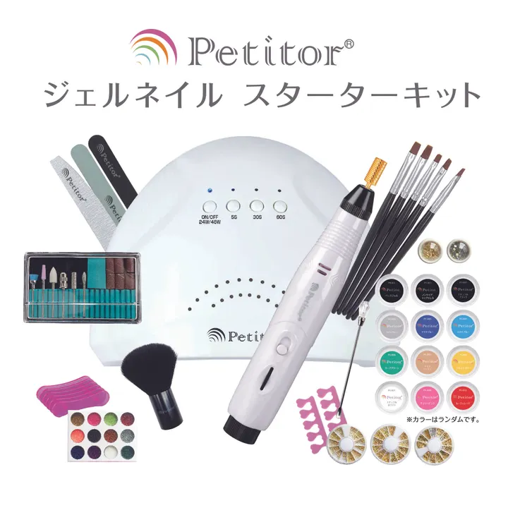 ハイパワー!48wの秒速硬化UV/LEDライト、 ネイルマシンの入門に最適で一番手軽な<プチトルC リファイン>、 カラージェル10色セット、ベースジェル、ノーワイプトップジェルなど アートからオフまでできる内容で、ジェルネイルデビューの方におすすめ ネイルサロン監修のスタートガイド付き 初心者でも安心してセルフネイルデビューできます ①プチトル ピュアシャインLED48W(KRD8010) 4,980円相当 ジェルネイルを硬化するUV&LEDライト ②プチトルCリファイン(KRD2004R-WT) 4,380円相当 ジェルネイルオフを行うセルフネイラー向けのネイルマシン ③ジェルブラシ5本セット 1,000円相当 ジェルネイルを塗るためのブラシセット ④ダストブラシ 680円相当 ネイルマシンで爪を削った際に出るダスト(粉)を払うブラシ ⑤ファイル3種セット 450円相当 爪の長さ・形を整えるための爪やすり ⑥ネイルジェル12個セット 2,980円相当 カラー10色 トップ・ベースジェル 計12個のジェルセット ※カラー10色はランダム ⑦ラメ・グリッター12色セット 1,000円相当 ジェルに混ぜてネイルアートに使用 ⑧ネイルパーツセット 600円相当 ネイルアートに使用し、デザインの幅を広げます ⑨ブラシホルダー 310円相当 ジェルブラシを置くためのホルダー ⑩フットセパレーター 100円相当 フットネイル(ペディキュア)をする際に使用。指の間隔を空け、作業がしやすくなります。 ⑪ネイルスティック 342円相当 ラメやパーツをすくったり、ジェルを混ぜる際に使用します。