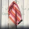 サイズ:約100×200cm 素材:コットン綿 こちらはスタンダードなタイプで、いろいろな使い方がしやすい大きさです。 天然素材コットン100%クロス チュニジアのハマム(トルコ風呂)だけでなく、地中海リゾートのスパセンターでも大活躍なフタFouta 、もともとはハマムを利用するおじさんの大判腰巻です。 いまや色やパターンも楽しくなって、様々な場面で利用されるユニバーサル布に! 湿気の多い日本では乾きにくい、かさばるタオル生地は不要です。 ヨーロッパの方は布使いがとても上手なので、お土産屋さんではこのフタを何枚も購入するというくらい人気があります。 フタの利用法・・・一度タオル代わりに使ってみてください! お部屋では、テーブルクロスやソファーカバー、目隠ししたいところへサッと広げて掛けてみたりもいいですね。 ベッドカバーとしても。コットンの優しい肌触りで滑らかなので敏感肌な赤ちゃん用のタオルケット としてもオススメです。 すぐにお洗濯ができ、乾きも早いので便利です。 手芸好きな方は、ちょっと手を加えてカーテンやクッションカバーなどにも変身させたりと布地としての活用もできます! 屋外では、ピクニック、アウトドアにシートとして。 海辺のバカンスではタオル代わりはもちろん、日よけに。すっと敷いてシート代わりにも。 大判でたっぷりと巻けるのでヨーロッパの方は肌寒いときにはストール代わりに、ひざ掛けなどの活用もOK! ひとつ旅に持っていくにも非常に便利です。