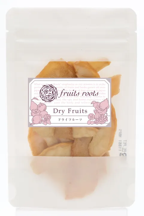 国産フルーツの旨味を最大限に引き出す無添加・砂糖不使用のこだわり製法 ■フルーツルーツの取り組み 日本の農家さんの生産現場では、傷や形の大小、形の不揃いなどで買い手がなく、廃棄処分されてしまうフルーツが少なくありません。 でもこれらのフルーツも農家の方々が1つ1つ愛情を込めて育てたもの。フルーツルーツのドライフルーツに使われているのは、 そんな規格外のフルーツを乾燥・加工して新たな命を吹き込んだものです。 このような地道な活動により、農家さんの支援、そして食料自給率のアップに少しでも貢献したいと考えています。