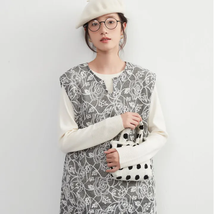 KNXT519・バラ柄チェーンステッチ総刺繍ニットソーキーネックチュニックベスト GRAY/M