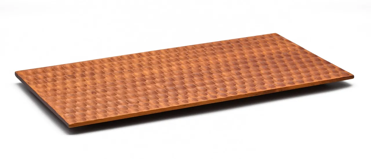 【概要】 職人が手作業で一つひとつ模様をくり抜いて仕上げた、ハニカム柄のボード。 業務用で要望の多いサイズを中心に、ご家庭用でも扱いやすいサイズまで、幅広く取り揃えています。 【こだわり】 ≪エキゾチックな雰囲気を演出≫ ハチの巣のような美しい凹凸が、どこか異国情緒を感じさせるエレガントな雰囲気を演出。 和食・洋食・エスニック、どんな料理にも自然になじみ、盛り付けをより印象的に仕上げてくれます。 ≪おいしさ長持ち、嬉しい機能性≫ ハニカムのくぼみに料理から出る水蒸気が留まることで、 パンやトーストはパサつきにくく、ふんわり感をキープ。 ソースや油が多い肉料理・魚料理でも、最後までおいしさを逃がしません。 ≪持ち運びやすい形状≫ 裏面に角度がついているので、指をかけやすく、持ち運びがスムーズ。 キッチンでもテーブルでも、使いやすさを実感していただけます。 ≪天然木ならではの温もり≫ なめらかな手触りと明るい木目が特徴のラバーウッド材を使用。 天然木ならではの温もりが感じられます。 ≪地球にやさしい植林材を使用≫ 東南アジアの計画植林で育てられた木材を使用。 植林から伐採までのサイクルが厳格に管理されているため、地球環境への負荷を最小限に抑えられます。 ≪熟練の職人によるハンドメイド≫ 一つひとつ職人が手作業で仕上げています。 手作りならではの風合いをお楽しみください。