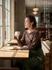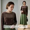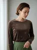 ベロアリボン柄立体プリント長袖Tシャツ・エレガントな艶感トロミタッチストレッチ性素材 BROWN-FREE