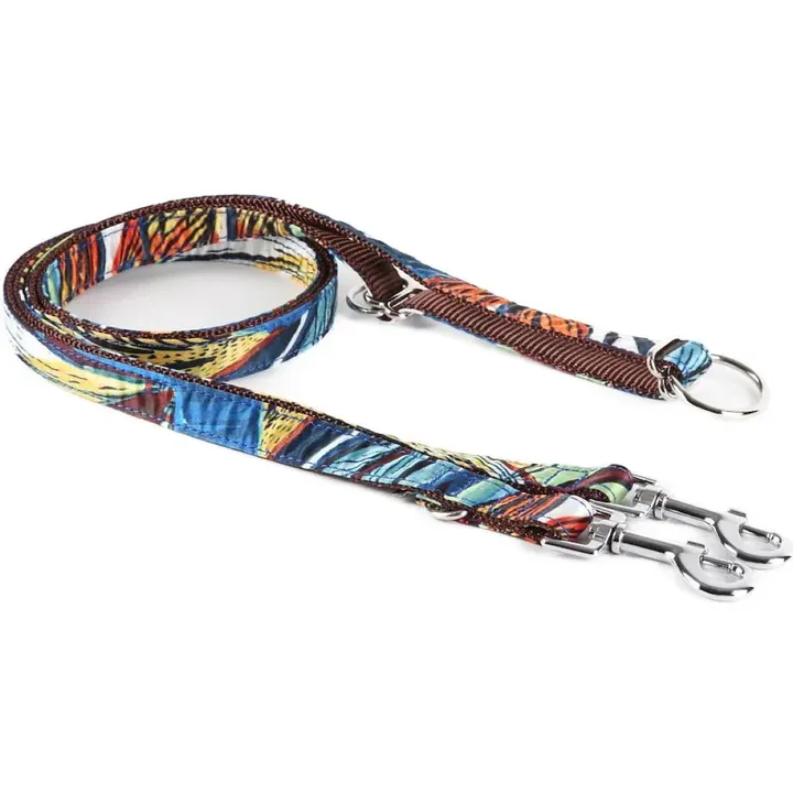 トロピカルスタイル(PORTLLIGAT) ポルトリガト 陽気なリゾートを彷彿させる華やかで明るいカラーが特徴です。 グリーン、ブルー、オレンジなど鮮やかで多様な色彩が織りなす、オリジナルデザイン。 ハンズフリーリードは長さ約210cm。 大小のリング位置はそれぞれ調節可能なマルチポジションのため、肩がけリード、手持ちリードとしても自由にお使い頂けます。