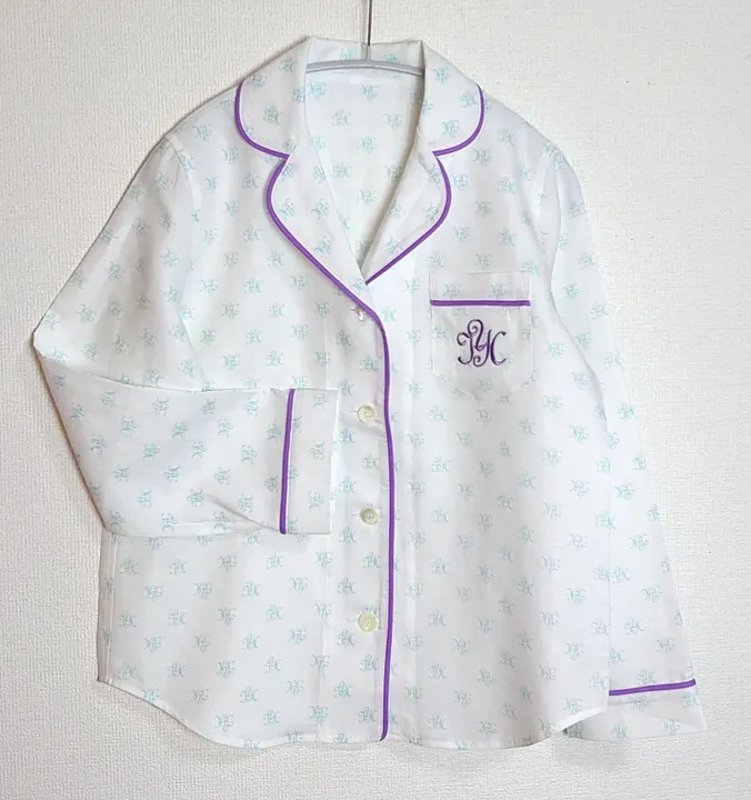 高級アイリッシュリネンを代表するハードマンズの高密度リネン生地で作ったパジャマです。 ヒデコ&ヨーゴホーム初のロゴをプリントした生地で特別感のある1着になりました。 60番手の糸を高密度に織った生地は、シワになりにくく、張りがありしっかりしているので、お洗濯しても驚くほど型崩れしません。 パイピングテープと同色の胸ポケット刺繡がフレンチシックな大人っぽさを醸し出しています。 縫い合わせはすべて折伏せ縫いになっているので、引っ掛かりがなく、ほつれる心配がありません。共布の袋は付いておりませんが、旅行用にロゴ入りの巾着袋をお付けしております。 ■レディースパジャマサイズ(平置き寸法) M 着丈61㎝、身幅(胸囲)50㎝、袖丈55㎝、アームホール18㎝、パンツ股下61㎝、パンツヒップ52㎝ L 着丈63㎝、身幅(胸囲)52㎝、袖丈57㎝、アームホール19㎝、パンツ股下64㎝、パンツヒップ55㎝ LL 着丈65㎝、身幅(胸囲)54㎝、袖丈58㎝、アームホール21㎝、パンツ股下64㎝、パンツヒップ57㎝