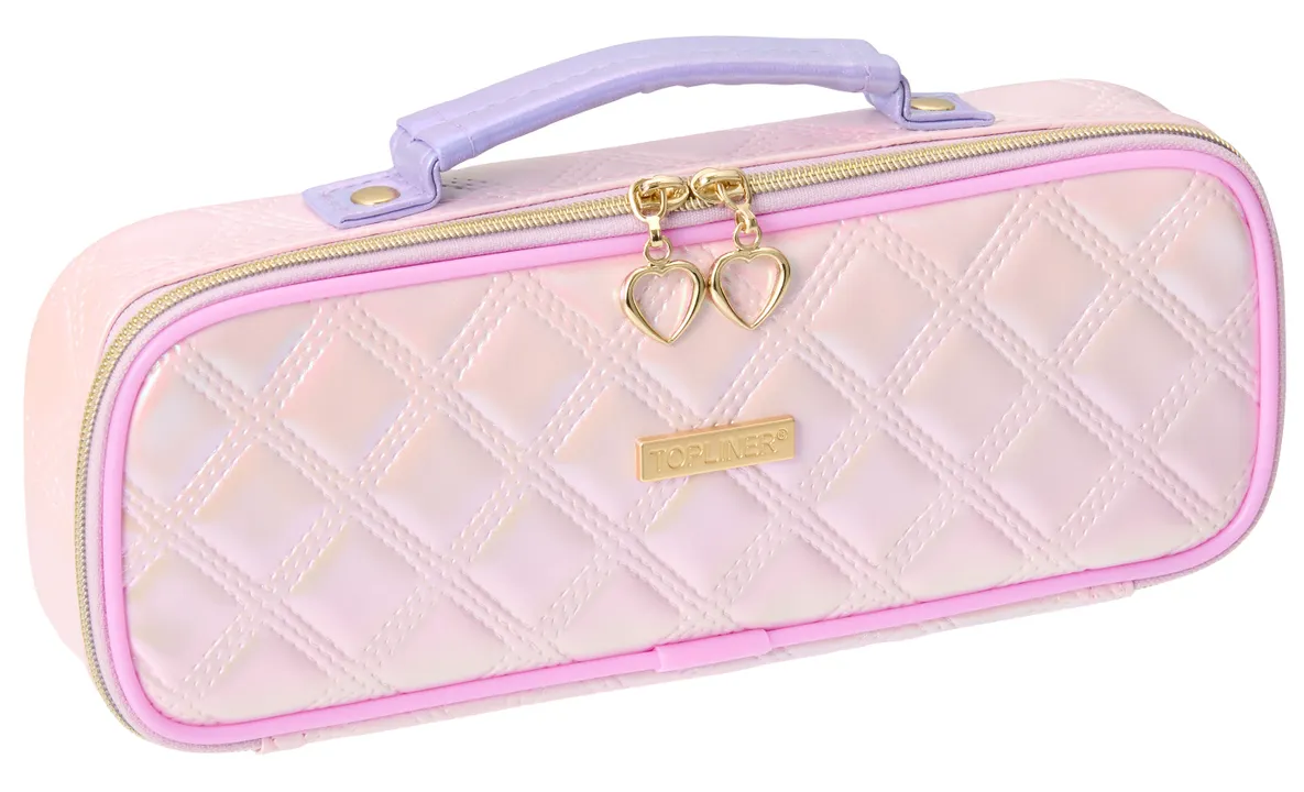 【光沢感のある生地とチャームが可愛い!機能性も抜群】 ・低学年のお子様でもファスナーが開けやすいように引っ張りやすい大きなハート形の引き手 ・本体にはトップライナーのロゴが入ったゴールドチャームが付いていて華やかさを演出 ・ふたの裏側には定規などの薄い文房具を収納できるメッシュポケット付き ・光沢感のある生地とぷっくりとした立体感がかわいいキルティング生地を使用
