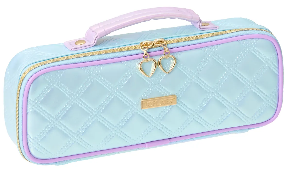 【光沢感のある生地とチャームが可愛い!機能性も抜群】 ・低学年のお子様でもファスナーが開けやすいように引っ張りやすい大きなハート形の引き手 ・本体にはトップライナーのロゴが入ったゴールドチャームが付いていて華やかさを演出 ・ふたの裏側には定規などの薄い文房具を収納できるメッシュポケット付き ・光沢感のある生地とぷっくりとした立体感がかわいいキルティング生地を使用