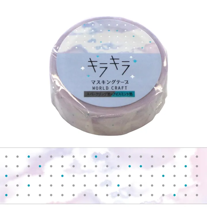 【 キラキラマスキングテープ 15mm Twinkle sky】  ★★ 箔を使用した、キラキラが可愛いキラキラマスキングテープ 〜 第3弾  Sky、Room、Textile の3つをテーマに <12柄> を揃えました ★★ に浮かぶ空に浮かぶパステルな雲模様。マーブルっぽさがおしゃれの決め手! 星に見立て等間隔に施されたドットと雲のコントラストがポイントです。 『スパークリング箔とアイスミント箔』 を使用しています♪