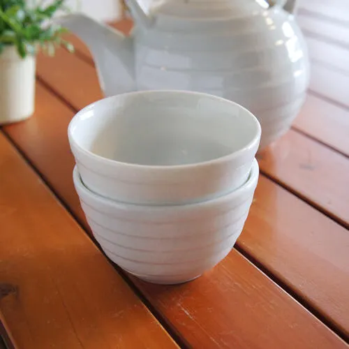 うっすらと青みをおびた白磁で、千段模様がきれいな陰影を作っています。スタンダードなカタチですが、上品で洗練された印象があるのはこの陰影のつくりだす立体感のおかげ。きっと飽きがこずに末長くお使いいただけるかと思います。