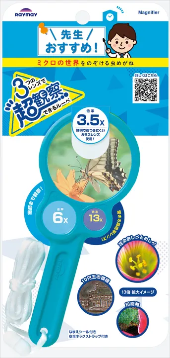 【先生と共同開発したルーペ】 ・倍率の異なる3種類のレンズがひとつになったルーペです ・3.5倍、6倍、13倍の3種類の倍率で観察ができます ・お名前シール付き ・強い力がかかると自動的に外れる安全パーツ付きのネックストラップ 【付属品】 名前シール、安全ネックストラップ