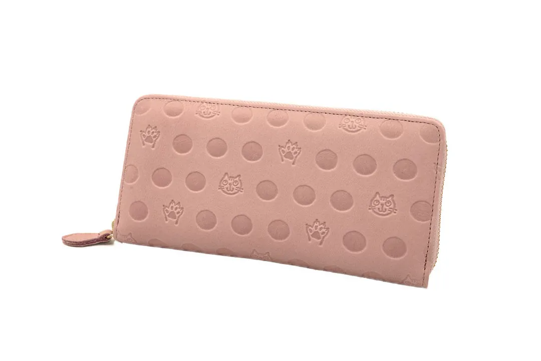 【使いやすいラウンドファスナータイプの可愛い猫財布、内側は抗菌・抗ウイルス加工の裏地で安心の牛革財布です】 ●水玉・猫・肉球と無駄な物が一切無い、猫好きの為の可愛い牛革猫財布 もう説明する必要がない位可愛いですね!ちょっぴり手書き風のデザインがまた良い味出してくれています。 プリントだと少し子供っぽくなりがちですが、型押しの陰影で柄を表現しているので派手さを抑えた仕上がりになっており、牛革の高級感も持ち合わせているので、大人の女性も持てる猫財布に仕上がっています。 ●内側に「抗菌・抗ウイルス加工」の裏地を採用、不安な世の中でも安心して使える財布を お金は天下の回り物と良く言いわれますが、不特定多数の方の手に渡り貴方の所へやって来ます。綺麗なお金もあれば綺麗ではないお金も勿論あるでしょう。ウイルスや菌が目に見えれば避ける事も出来ますが、お金に付いているか付いていないかまでは判りませんよね。 *実際オーストラリア連邦科学産業研究機構(CSIRO)の実験では紫外線の影響を受けない状況下では「最大約28日間残存する」との研究発表がされています。 言ってる事は何となく分かるけど、じゃあどうしたら良いのって思いますよね? そんな不安な気持ちを少しでも払拭して貰おうと思い、この財布の裏地には「抗菌・抗ウイルス加工」を施した生地を選択しました。口腔衛生用の抗菌材をベースに各種試験で安全性を確認、繊維上の特定のウイルスを減少させ、更には特定の菌の繁殖までも抑えてくれる優れものです。 何も加工されていない裏地を使った財布より圧倒的に安心してお使い頂ける、機能的な財布に仕上がっています。これがあるから100%安全とは決して言えませんが、気持ちの上だけでも安心感を持って使って頂けると思います。 またこの裏地はグレーの杢調に仕上げてあり、落ち着いた雰囲気が洗練されたお洒落感を演出してくれます。 ●しっとりとした素上げの牛革が使い込む内に経年変化も楽しめる!長く使える猫財布 本体素材には素上げの牛革を使用しました。手に触れた時の感触は素上げならではの感触です。 *素上げとは・・・染色した後の革に着色剤や仕上げ剤などの薬品を殆ど使用せず、革本来の表情を残したまま仕上げる革の事。ナチュラルレザーとも言われます。 その為若干の色落ちやシミになりやすいといったデメリットもありますが、使い込むほどに深まる色味や艶などの経年変化を楽しむ事が出来る財布に仕上がっています。是非末長くお使い頂き、その変化をお楽しみ下さい。 *必要以上の色止めや染色を行っていない素上げの革を使用しています、また牛の成長過程で付いた皺や細かい傷などがある場合がございますが、これは避ける事が出来ないものです、天然の証としてご理解ください。 ●可愛いだけじゃない、大容量でしっかりとした財布機能が充実! 可愛いだけじゃダメですよね、財布なんですから、という事で財布機能にも拘っています。 開閉は大きく開くラウンドファスナーを採用しました。財布の周りをぐるっとファスナーが取り付けられているので、フルで開けると財布の中身が一目瞭然!もう「あれ何処へ仕舞ったっけ?」とはおさらばです。毎日使う財布としての使いやすさを追求しました。 札入れは2か所、手前に大型の小銭入れ、反対側に札入れ、もう一つは中央にお札を入れる事が出来ます。どちらも10000円札を折らずに入れる事が出来る大きさです。カード入れは手前に6枚、奥に6枚の計12枚のカードを収納出来ます。 小銭れにはギャルソン型(ボックス型とも)の小銭入れを採用。 このギャルソン型の小銭入れの特長は、がばっと小銭入れが開くので小銭が取りやすく支払いがスムーズな所!ぱっと見るだけで小銭が判別出来るので「小銭は1円まできっちり支払いたい!」そんな貴方にピッタリの仕様です。 お釣りを受け取った後も簡単に仕舞えます。一度使うとこの便利さは病みつきの便利な小銭入れです。 ●日本の熟練した財布職人の技 全て熟練の財布職人による手作業で制作され、美しいシルエットと耐久性、全てのパーツが安心の日本製。 ファストファッション全盛のこの時代、安かろう悪かろうで妥協して選びがちではありませんか?大量生産品では決して出来ない職人が一点一点魂を込めて生み出したこの財布なら丈夫で長持ち、不意な買い替えは必要ありません。 財布は毎日使うものです、安物買いの銭失いとは良く言いますが、長く使える財布を買う事が最も節約になるのではないでしょうか。 海外に生産を移す工場が殆どの中、国内で財布を作り続ける工場で全て制作しています。有名ブランドの財布なども手掛けているので、その品質はお墨付きです。