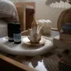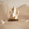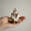 『1日のざわめきを静かに溶かす、夜空からすくい取った月の結晶』 夜空から落ちてきた“月の欠片”を、そのまま手のひらに閉じ込めたようなアロマストーンオブジェ。 月から取れたひとかけらのクリスタルは、眠る前、きらめきで心を明るく照らしてくれます。 アロマオイル(精油)を1〜2滴垂らすだけで、ゆっくりと優しい香りが広がります。 電気や火を使わないので、香りを感じながら安心して眠ることができます。 アロマストーンと、輝きをさらに増してくれる台座の2点セットです。 落ち着く時間のなかった1日の終わり。 月光浴をしているかのように、夜の空気を静かに満たしてくれます。 【 HOW TO 】 1〜2滴の精油をストーンに垂らすと、 半径約1mほどの空間にやわらかな香りが広がります。 香りの持続は1〜3日ほど(湿度や精油の種類によって異なります)。 香りが薄くなったら、また少しずつ垂らしてお使いください。 お手入れをする場合、水洗いはせず、乾いた布で軽く拭いてください。 ※台座は、精油が垂れると塗装が剥げる場合があります。 気になる場合はアロマストーンにしっかり精油を染み込ませてから置いてご使用ください。 台座に精油がこぼれたら、すぐに拭き取ってください。 【 DETAIL 】 月の結晶のような、幻想と夢想のアロマストーンオブジェ。 360度、どこから見ても表情が違うので、お好みの角度で置いていただけます。 きらめくオーラを放つ、ゴールドカラーをランダム塗装しています。 そのためアロマオイルを垂らした跡が気になりにくいデザインです。 手のひらサイズですが、存在感抜群。 ベッドサイドや玄関など、小さなスペースでも場所を取らず、インテリアとして映えます。 【 アロマストーンとは? 】 精油(アロマオイル)を滴下するだけで香りを楽しめる「香るインテリア」です。 精油をすばやく吸収し、ふんわり香りを拡散します。 半径1m程度のパーソナルスペースで、自然な香りが広がります。 電気や火を使わないエコな芳香器のため、 デスクやベッドサイドでも気軽に使うことができます。 香りが広く充満しないので、 強い香りが苦手な方にもおすすめです。 また、香りは1日〜3日程度で消えてゆきます。 そのため1つのアロマストーンで色々な香りをお楽しみいただけます。 【 おすすめの使い方 】 ✔︎ベッドサイドに置いて、就寝前の癒しの時間のお供に ✔︎玄関やお手洗いに飾って、香りと共にインテリアオブジェとして ✔︎デスクに置いて、集中したい作業時間のお供に 【 SPEC 】 材質:石膏(プラスター) サイズ:6.8cm×6.8cm×8cm(台座含む) ハンドメイド/日本製