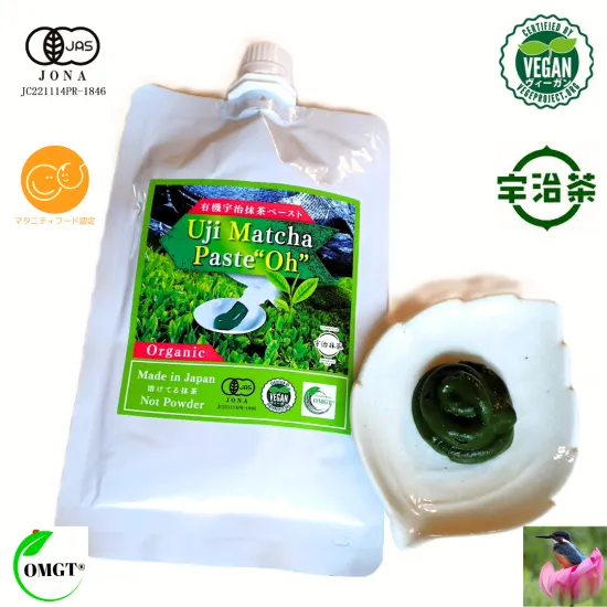 宇治抹茶ペーストOhは、簡単・便利にオーガニック抹茶の風味を楽しめるペースト状の有機抹茶製品です。 抹茶ドリンクやスイーツ作りをもっと手軽に楽しみたい方におすすめのアイテムです。 独自の製法により、調理中も色味が損なわれにくく、焼き菓子などに使っても抹茶らしい見た目を保ちやすいのが特長です。 茶筅を使わずに水やお湯に溶けやすいため、手軽に扱え、調理の準備もスムーズになります。 オーガニック食品やシンプルな素材選びを重視する方にも嬉しい仕様となっており、幅広いライフスタイルに寄り添います。 <特徴> 1)安心感のある原材料 有機JAS認証、ヴィーガン認証取得。 着色料・防腐剤などの添加物は使用していません。 2)外部認証を取得 マタニティ・フード認定、京都府チャレンジバイ制度の認定取得済み。 3)すっきりした設計 砂糖不使用で、抹茶本来の風味を味わえます。 カロリーやカフェインの摂取を気にする方にも取り入れやすい構成です。 4)アレンジが豊富 抹茶ラテ、抹茶ソーダ、抹茶レモネード、抹茶カクテルなども手軽に作れます。 粉っぽさが出にくく、口当たりがなめらか。年齢問わず使いやすい仕様です。 抹茶ご飯、抹茶おにぎり、抹茶おこわ、抹茶寿司飯、抹茶ドレッシング、抹茶酢味噌など、さまざまな料理へのアレンジにも使えます。 5)使いやすさ 茶筅なしでも溶けやすく、粉が飛び散りにくい形状のため、調理時の手間が抑えられます。 竹製茶筅を使わないため、異物混入などのリスクも軽減されます。