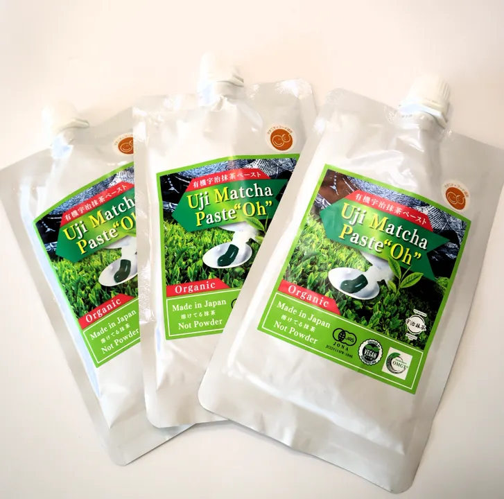 宇治抹茶ペーストOhは、簡単・便利にオーガニック抹茶の風味を楽しめるペースト状の有機抹茶製品です。 抹茶ドリンクやスイーツ作りをもっと手軽に楽しみたい方におすすめのアイテムです。 独自の製法により、調理中も色味が損なわれにくく、焼き菓子などに使っても抹茶らしい見た目を保ちやすいのが特長です。 茶筅を使わずに水やお湯に溶けやすいため、手軽に扱え、調理の準備もスムーズになります。 オーガニック食品やシンプルな素材選びを重視する方にも嬉しい仕様となっており、幅広いライフスタイルに寄り添います。 <特徴> 1)安心感のある原材料 有機JAS認証、ヴィーガン認証取得。 着色料・防腐剤などの添加物は使用していません。 2)外部認証を取得 マタニティ・フード認定、京都府チャレンジバイ制度の認定取得済み。 3)すっきりした設計 砂糖不使用で、抹茶本来の風味を味わえます。 カロリーやカフェインの摂取を気にする方にも取り入れやすい構成です。 4)アレンジが豊富 抹茶ラテ、抹茶ソーダ、抹茶レモネード、抹茶カクテルなども手軽に作れます。 粉っぽさが出にくく、口当たりがなめらか。年齢問わず使いやすい仕様です。 抹茶ご飯、抹茶おにぎり、抹茶おこわ、抹茶寿司飯、抹茶ドレッシング、抹茶酢味噌など、さまざまな料理へのアレンジにも使えます。 5)使いやすさ 茶筅なしでも溶けやすく、粉が飛び散りにくい形状のため、調理時の手間が抑えられます。 竹製茶筅を使わないため、異物混入などのリスクも軽減されます。