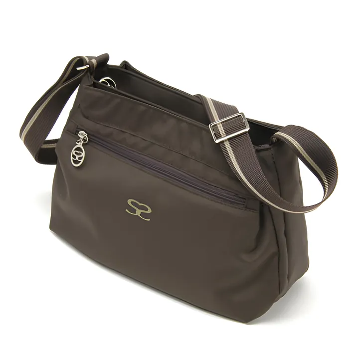 ナイロン素材のバッグ.季節を問わずどんなシーンでも大活躍のシンプルデザイン!旅行に行くときのサブバッグにもおすすめです。開口タイプ/ファスナー式 ■ポケット/ (内側)ファスナー×1、オープン×2 (外側)前ファスナー×1、前後マグネット各1