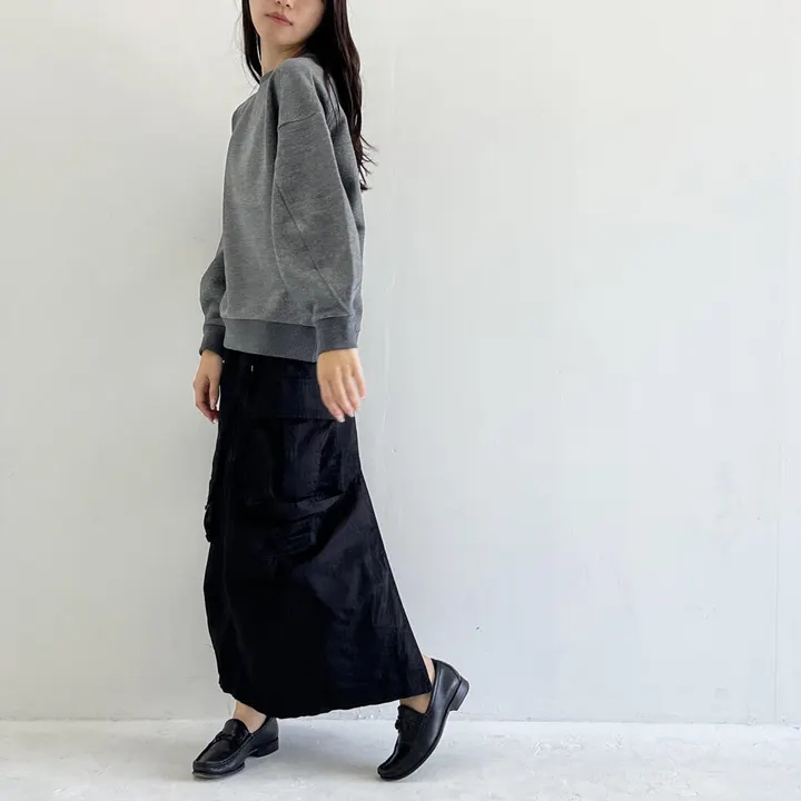 30/10裏毛カーブ切替トレーナー 一般的なスウェット生地と同じ厚みの柔らかい裏毛 肩から袖にかけてカーブした切り替えをいれ肩のラインが特徴で 横から見たスタイルが痩せ見えするよう工夫しています。 シンプルながら独特のディテールがビンテージっぽい雰囲気で、 カジュアルで女性らしいトレーナーです。 着丈62cm 身巾56cm 裄丈72cm 30/10裏毛 裏ループにも繊維原料を櫛で梳き均して、繊維方向がそろったわた状の塊にする作業で繊維を糸にせずにそのまま編んで生地にする際、短繊維や夾雑物、ネップなどを完全に除去する工程を追加することにより、糸ムラや毛羽が少ない均整な糸なるよう丁寧に糸を配してふくらみを出した柔らかい素材です コットン 100%、リブ:コットン95%PU5%
