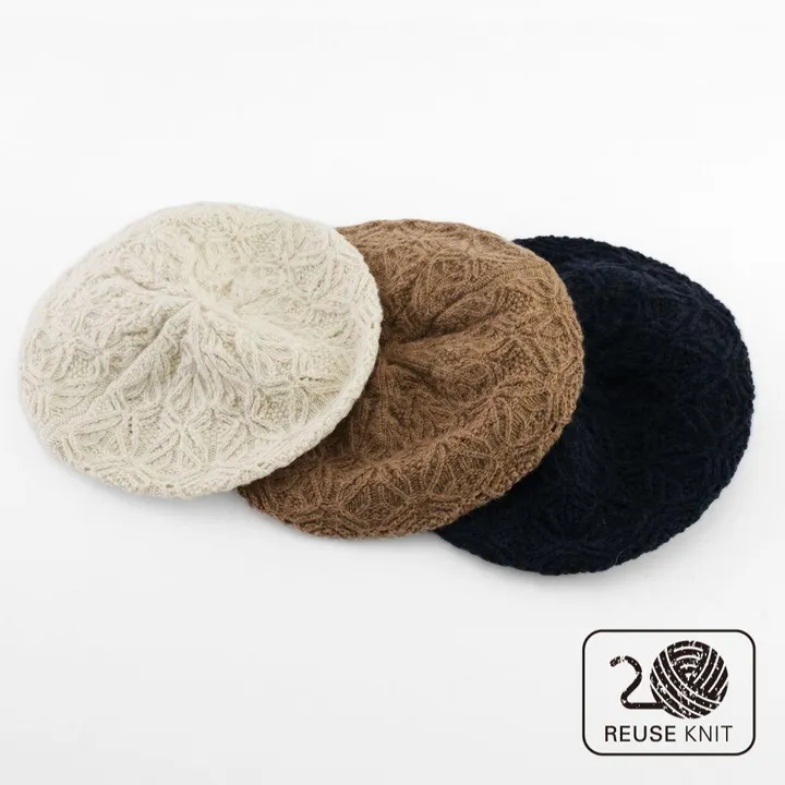 全面に施した繊細な地模様が上品なベレーキャップ。パンツなどのハンサムコーデに合わせれば、少しだけフェミニンで柔らかいな印象に仕上がります。 生産過程で出る残り糸や不要になったウール衣類などの毛糸を紡ぎなおした、リサイクル素材を使用しています。廃棄物が削減でき、生産過程で必要な水やエネルギーの使用を抑え環境負荷を軽減できる地球に優しいニットです。