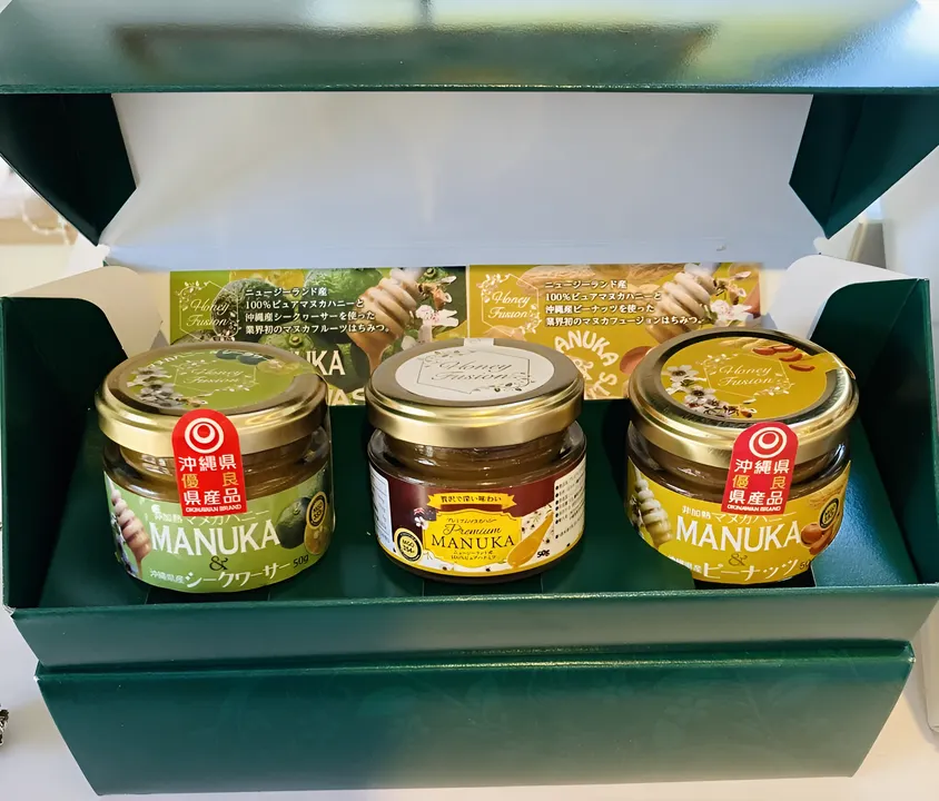 内容量: ・プレミアムマヌカハニー 50g ・マヌカ&シークヮーサー 50g ・マヌカ&ピーナッツ 50g 3商品がオリジナルBOXに詰められています。