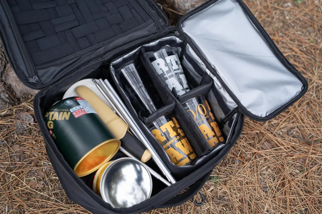 WAITER-U TOOLBAGは、キャンプギアの散らかりやすい小物類を体系的に管理し、忘れ物を防止するために設計された多機能ツールバッグです。都市生活とアウトドアを両立する「ウィークエンドキャンパー」のために、キャンプサイトでの使いやすさと日常での携帯性を両立させました。 カスタマイズ性: 外面にマジックテープタイプのワッペンを自由に装着可能。お気に入りのワッペンで個性を表現でき、気分に応じて付け替えることで、まるで複数のバッグを所有しているような楽しみ方ができます。 忘れ物防止システム: キャンプで最も避けたい忘れ物。いつも決まった場所にギアを収納する仕組みを作ることで、忘れ物を最大限少なくします。定位置管理によりパッキングの効率も向上します。 衛生的な調味料管理: 調味料ケースは取り外して水洗い可能。使い切っていない調味料は、しっかり蓋を閉めていても微妙に漏れることがありますが、内部素材は水洗いOKで衛生的にお使いいただけます。 フレキシブルな間仕切りシステム: お持ちの様々なサイズのギアに合わせて、間仕切りを上下左右好きな位置に調整可能。ギアのサイズや形状に応じた最適な収納レイアウトを実現します。 大型ポケット: 底面には厚さ10cmの大型ポケットを完備し、12インチ(約30cm)のスキレットやフライパンがそのまま収納可能。キッチンペーパーやCB缶の収納にも便利です。 ラバーループ収納: 上面の蓋には複数のラバーループを配置。LEDランタンの充電ケーブルやガイロープなど、絡まりやすい小物を巻き付けて整理できます。 蓋裏大型ファスナーポケット: 蓋の裏側には一面に広がるファスナーポケットを装備。キャンプ場でもらう案内図やパンフレットを折らずに収納できます。 自立構造: 中に何も入っていない状態でもしっかり自立するため、ギアの出し入れが容易で、パッキング作業がスムーズに行えます。 携帯性: 上面中央にハンドルを配置し、持ち運びやすい設計。手提げでもストレスなく移動できます。 システム拡張性: WAITER-U Backpackの底面に装備された4つの金具と、TOOLBAG四隅の丸いカラビナを連結することで、ハンズフリーで多くの荷物を運搬可能。モジュラーシステムとして機能します。