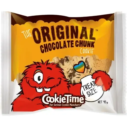 🔳1983年創業以来ずっと変わらないクッキータイムの定番クッキー! 🔳ザクザクな食感にゴロゴロチョコレートのクッキー。人気ナンバーワンクッキー。 🔳ニュージーランドのポピュラーな直径約9センチの大判クッキー! 🔳電子レンジで10秒温めたら焼きたてのようなクッキーに変身! ※予告なくパッケージ変更となる場合がございます。予めご了承下さい。 【クッキータイムとは?】 1983年にクライストチャーチで生まれ、今ではニュージーランドで知らない人がいない程有名です。スーパーマーケットやコンビニはもちろん、ホテルの部屋に置いてあったり、ニュージーランド航空で機内食として配られたりもするので、ニュージーランドを訪れる人は必ず目にすることになります。ニュージーランドお土産菓子代表!今では原宿にも直営店をオープンし焼きたてクッキーを提供する人気ショップです。 【クッキータイムのクッキー】 お母さんが焼いてくれたホームメイドクッキーのようにフレッシュバターやゴロっとしたチョコレートチャンクを使用。 【クッキータイムのキャラクター<クッキーマンチャー>】 クッキータイムのオリジナルキャラクターはクッキーモンスターではなく、「クッキーマンチャ—」という名前で、クッキー同様ニュージーランドで愛されています。いたずら好きのクッキーマンチャー!マンチャーは「むしゃむしゃ食べる人」という意味で、その名の通りおいしそうにクッキーをむしゃむしゃ食べています。 【クッキータイムPOP】 クッキータイムではPOPをニュージーランド本国で作成しているため、販売して頂くためのPOPをデータにて提供が可能です!何なりとお声がけ下さい。 ※詳細画像内にもPOP画像を添付しておりますので、参考にしてください。