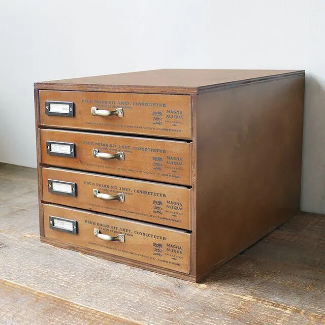 北海道 旭川市の自社工場で製作しています 機能的で見た目も◎。 A4サイズが入るアンティークな風合いの書類ケース。 A4サイズは、クリアファイルごと入るので便利。 3枚目写真は薄いピンクのクリアファイルにA4のコピー用紙を入れたものを引き出しの中に入れて撮影しました。 引き出しにはアンティークな風合いのラベル入れ金具がついていて整頓に便利。 6枚目の写真は BREA-1419 の書類ケースと組み合わせた使用例です。 ■商品サイズ 本体外寸   約 横幅27×奥行35.4×高さ23.5cm 引き出し内寸 約横幅23.2×奥行31.2×高さ3.8cm  (板の厚みなどで、多少の誤差が出る場合があります) ■材質 合板を使用。 木目、色合いなどが1つ1つ違います。