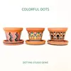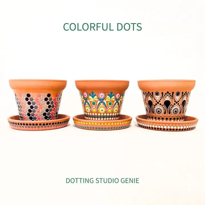 素焼きの植木鉢や器の自然な質感に、鮮やかなドット模様を組み合わせ、暮らしの中に彩りを添えます。 実用的でありながら、置くだけで空間が華やぐ“使えるアート”です。