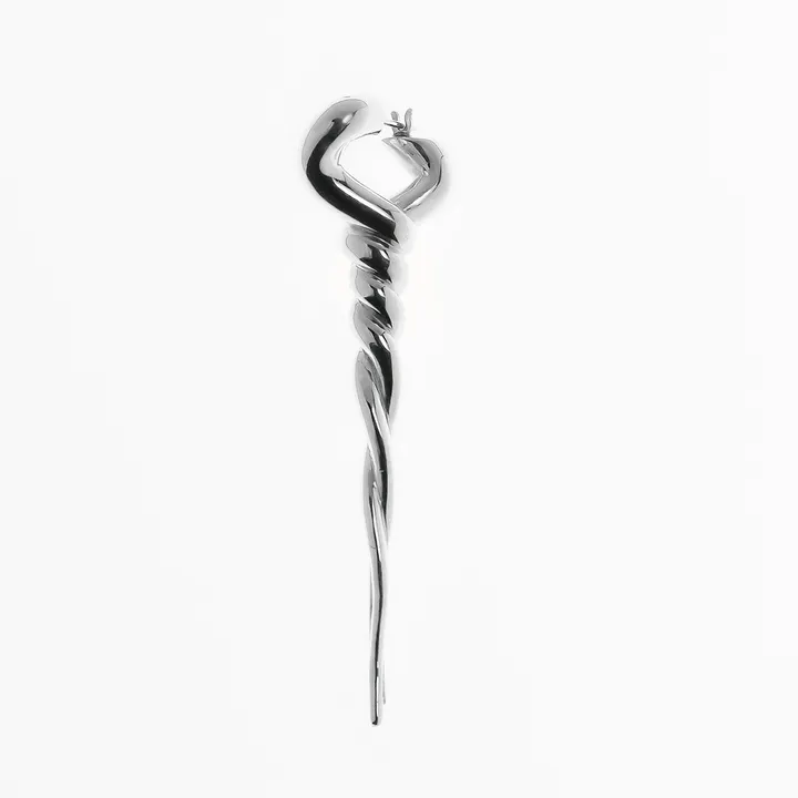 ●Description: 受注生産商品。 こちらは製作に3週~1カ月お時間を頂いておりますので、ご了承ください。 左耳用。どちらの耳でも着用可能ですが左耳での着用を推奨。 緊張と緩和。 1 個人の中で絡み合う、2 つの感情のように混ざり、溶け合う。 ヒンジ付きイヤリングのデザインが適度に揺れ、感情的な反応を呼び起こす。 ●Material: Sterling Silver925(ロジウムコーティング) ●Details: 全長ー62mm 幅ー18mm~1.5mm 重さー10g