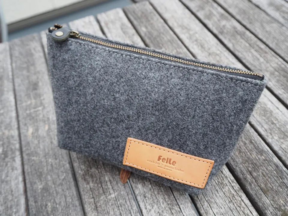 [recycle Felt = 再生フェルト] × [genuine Leather = 国産本革] ペットボトルを回収してつくられた独自開発の再生フェルト、 つかいこむほどに経年変化する国産の本ヌメ革、 普段は交わりあうことのないふたつの“環境素材”。 味わい、温かみ、軽さ、丈夫さ、弾力性、耐久性、防虫性、形状安定性… お互いの素材の良さを引き出し、上手く調和させることで、オン・オフを問わず、 愛着をもって長く使っていただける新しいスタイルのアップサイクルプロダクツ。 FelLe®(フェルレ)は、そんな想いを込めた新しいエコプロダクトブランドです。 ――― 商品説明 ――― 中身を守る適度なクッション性を兼ね備えたカードポケット付きポーチ ・美容アイテムや充電器、音楽プレーヤーなどの持ち運びに便利なポーチ ・厚手の再生フェルト素材のクッション性を活かして、中身を守る機能性のあるポーチです。 ・収納力のあるペンケースとして使用しても便利です。 ・外側にはカードが入る本革のポケットも配置しています。 ・ファスナーの持ち手やポケットの本革を使用しています。 ・フェルト生地は、あえてムラ感を出したスモーキーカラーとなる特殊製造オリジナル生地。 素材: 再生ポリエステル 本革 サイズ: 約W220×H135×D70㎜ 重さ: 約70g カラー展開: 7色 ――― お買い上げ前にお読みください ――― ・本革を使用している部分には、本革特有の多少の表情のムラや傷、手触りの違い等がありますが、天然本革の一般的な特長であり損傷ではありません。 また、日光や外気や使用時の手触り等により、経年変化を起こし、色が濃くなることがあります。 ・生地のフェルトの素材の性質上、摩擦により毛玉ができることがありますが、ハサミなどでカットしてください。