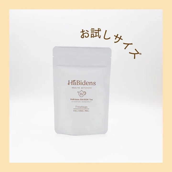 〈7包入:サンプル〉 ■HaBidens BAISEN Tea/ハービデンス バイセンティー 私たちの製品づくりは「お茶」からスタートしています。 1996年の発売から長年愛されてきたお茶製品を、現代に合わせて手軽に摂り入れられるよう、水出しができるような処方に変更して生み出されたのがバイセンティーです。水出し、お湯出し、煮出しでお飲みいただけます。 身体の約6割は水分。だからこそ身体はどんな水分を摂るかで変わってくる、と考えています。 毎日の水分補給に適した良質なハーブティーです。 ◎ノンカフェインで利尿作用なし ◎完全無添加 ◎100%国産原料 ◎農薬・化学肥料不使用の宮古島産自社原料を使用 (宮古ビデンス・ピローサ®、宮古春ウコン) ◎安全性自主点検認証取得済 大麦ベースで仕上げた、麦茶のように朝起きてから寝る前まで、どんなタイミングでもごくごく飲めるハーブティーです。