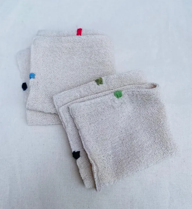 ネパールで手織りした無染色の布を日本で丁寧に縫製しました。 とにかくふわふわの肌触りで、吸水性も抜群で汗を優しく吸ってくれます。 この気持ちの良さをぜひ使って実感して欲しいです。 お洗濯していただくとさらにふわふわになります。 アクセントにラオスで天然染料で染めた手紡ぎの糸をそれぞれ4色、手刺繍しました。 自然の色と手で紡がれた柔らかい糸の感じがが布の優しさを引き立てとても愛らしい一枚になりました。 手仕事の詰まった一枚、プレゼントにもピッタリです。 ●ピンク・水色・薄グレー・紺の4色刺繍 ●黄色・黄緑・緑・濃グレーの4色刺繍 の2種類です。