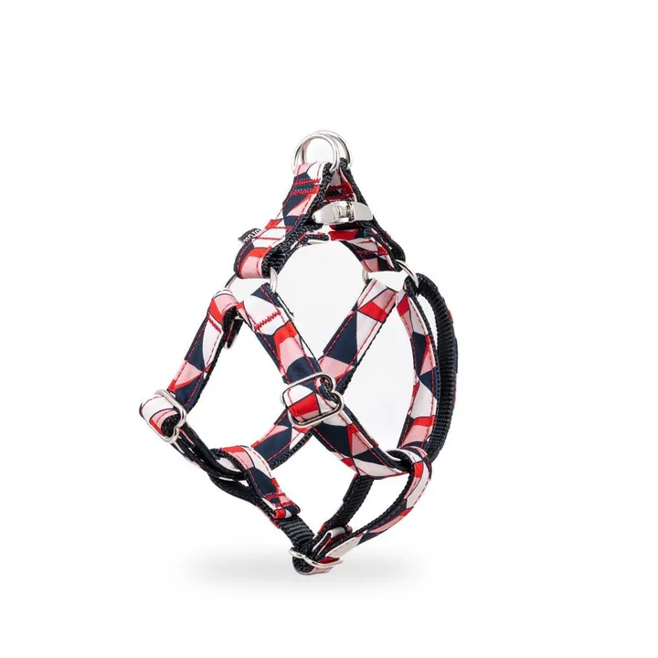 モダンでアートな幾何学模様 60年代への旅? 伝統や職人技を表現してくれるような幾何学模様が再来。 ホワイト、ネイビー、ベビーピンク、淡いレッドが織りなす幾何学模様と、赤い糸のステッチがよりマッチしています。 ? このハーネスは非常に丈夫で心地よい手触りです。 お散歩中に愛犬が快適に過ごせるようデザインされており、簡単に素早く装着することが出来ます。 ハードウェアには高品質のアルミニウムを使用し、ポリッシュ加工されています。 ? ※XXSサイズは裏地ナイロン無しで薄めの素材感になります。体重1.5?3キロ以下の超小型犬・子犬向きです。 ? ? 素材 裏地:ポリエステル100%リボン(エコテックス認証取得)表地:ポリエステル100%バックル:特許取得のアルミニウム製サイドリリース