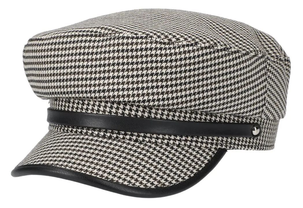 細かい千鳥模様の生地を使用したマリンキャス。パイピングとベルト部分のレザーで上品な仕上がりに。小ぶりでかっちりとしたシルエット。「大人の女性」らしさを引き出してくれます。